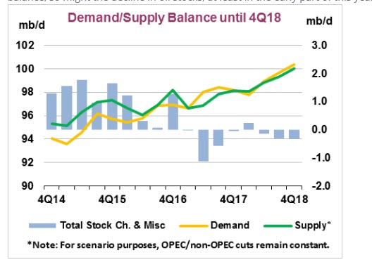 ” The International Energy Agency (IEA) today published their forecast for oil demand growth in 2018 at 1.4 million bpd from a previous projection of 1.3 million bpd. However, the boost in output, particularly in the U.S., will outweigh any growth in demand and increase global oil inventories. The IEA reported, “Today, having cut costs dramatically, U.S. producers are enjoying a second wave of growth so extraordinary that in 2018 their increase in liquids production could equal global demand growth”