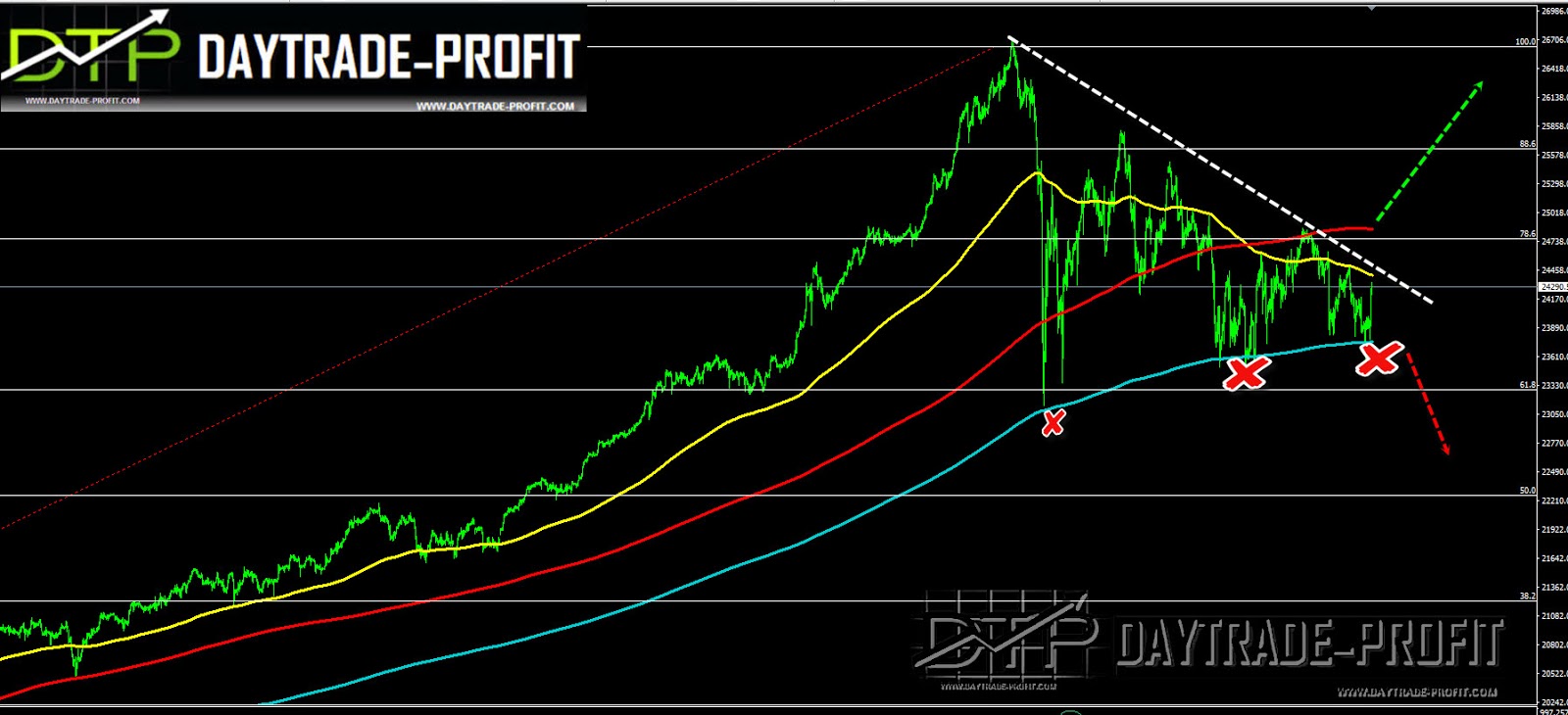 we saw last week The first option i mention who was to continue drop to the area 23,100-23,300 + and from there exit to an ascending process –pay attention to last rally (started at October 2016) I deliberately put the Fibonacci levels on the charts A 38.2%-61.8% retracement is the minimum requirement for a pullback – you can see that the best correction level for the last rally in the markets is in the area 23,100 + _ points